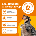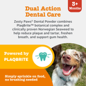Zesty Paws® Dental Powder combines PlaqBrite™ botanical complex and clinically proven Seaweed to help reduce tartar & plaque, freshen breath, and support gum health. Simply sprinkle on food — no brushing needed.
